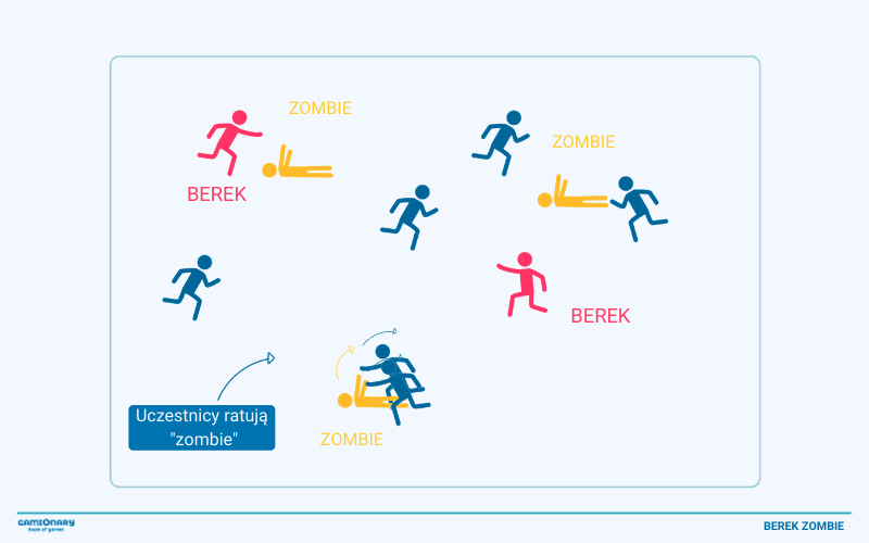 By uratować złapaną osobę, dwóch uczestników musi złapać za ręce zombie i podnieść razem do góry.
