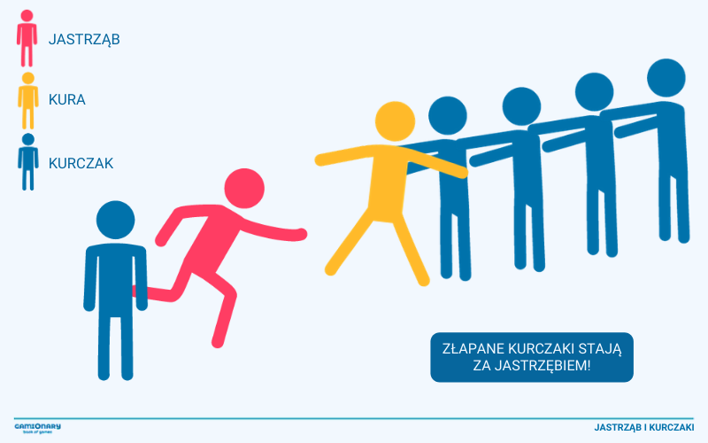 Pozostali gracze są kurczakami, ustawiają się za kogutem w rzędzie trzymając się ubrania osoby przed sobą.