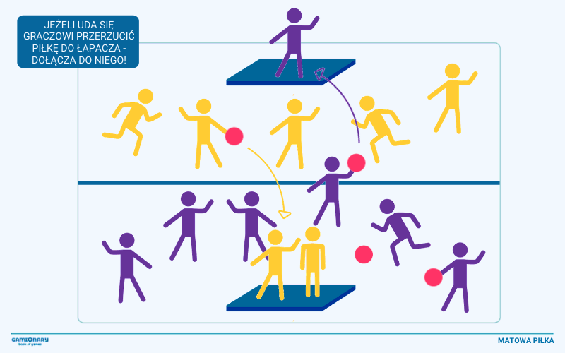 Jeżeli piłka zostanie przechwycona przy podaniu w locie, osoba, która najdłużej znajdowała się na macie musi wrócić na swoją połowę.