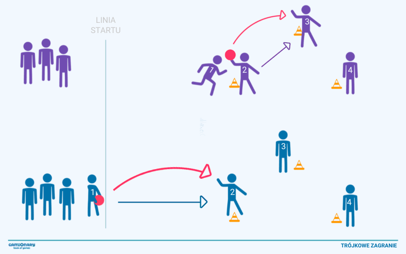 Następnie zawodnik nr 2 podaje piłkę do zawodnika nr 3, znajdującego się na drugim boku trójkąta i również przechodzi na jego miejsce.