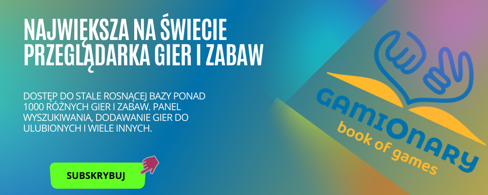 Link do gry Gry i zabawy towarzyskie to niekończący się temat dlatego zapraszamy do skorzystania z naszej wyszukiwarki gier i zabaw gamionary. Mamy też w zanadrzu 6 gier towarzyskich, które dają możliwość rozegrania przebekowych dialogów: GRY NA IMPREZĘ Możesz też zajrzeć do wcześniejszych list gier na naszym blogu, które możesz znaleźć tutaj. Jeżeli szukasz więcej filmików z grami towarzyskimi, znajdziesz tego dużo w naszym centrum filmików czyli Youtube. Zajrzyj też do naszej księgi gier, gdzie wszystkie gry są podzielone na kategorie.