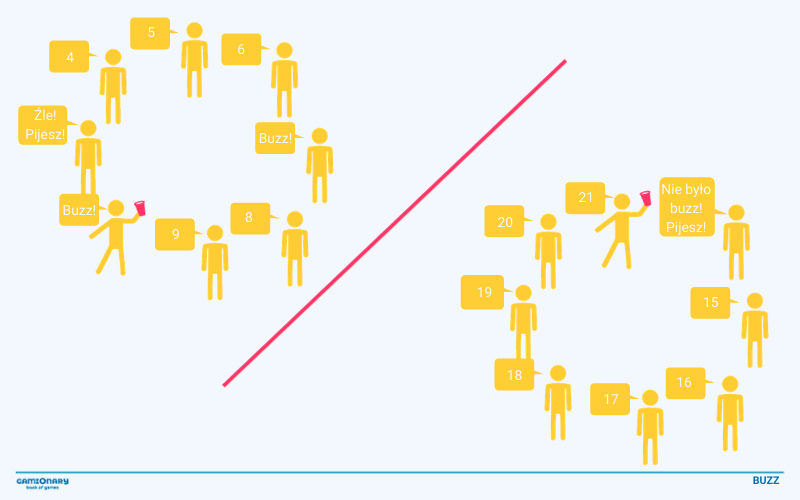 - Jeżeli zawodnik nie powie przy danej liczbie buzz lub powie przy innej liczbie wówczas musi wypić.
