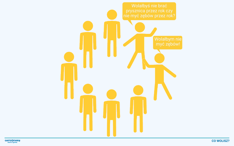 - Podaj dwie kontrowersyjne sytuacje jak np. „Czy wolałbyś brak prysznica przez rok lub brak mycia zębów przez rok?”