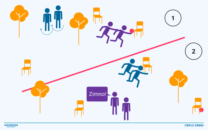 - Pozostali uczestnicy podpowiadają mu/im mówiąc ,,ciepło” lub ,,zimno”.