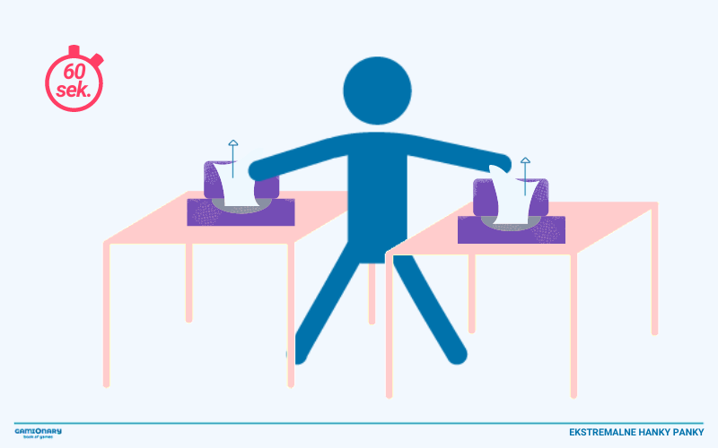 - Każdy gracz ustawia się między stolikami tak aby miał z każdej strony jedną paczkę chusteczek.