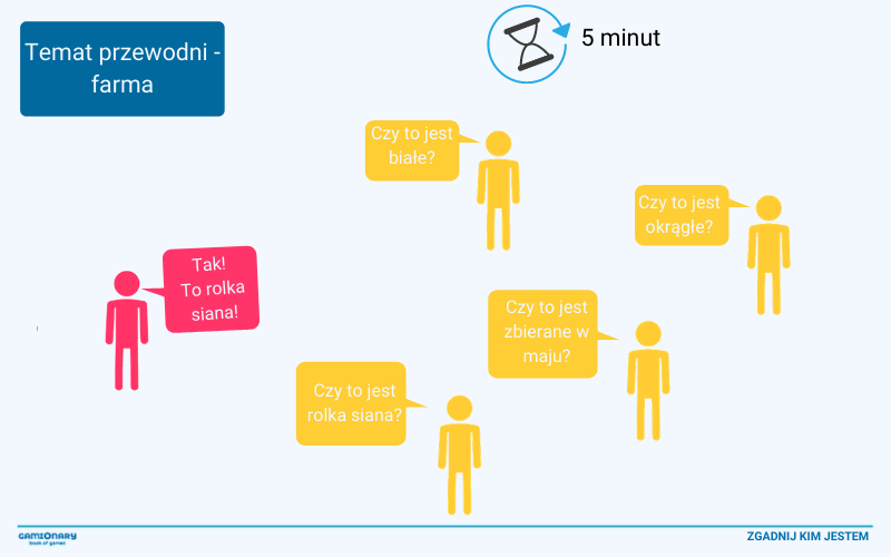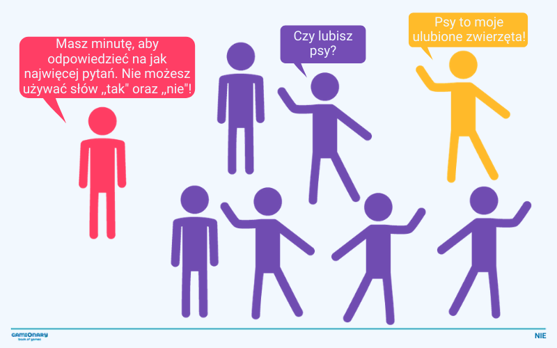 - Uczestnicy zadają pytania, gdzie odpowiedzią na nie może być tylko ,,tak” lub ,,nie”.