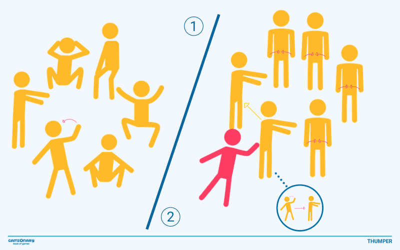 - Zawodnicy razem w jednym rytmie uderzają dwukrotnie dłońmi w swoje uda po czym pokazują jeden z 3 dostępnych znaków: Obrona: Położenie skrzyżowanych rąk na klatce piersiowej. Ładowanie: pokazanie dwóch kciuków na wysokości głowy skierowanych do tyłu. Strzał: pokazanie ,,pistoletów” z palców w kierunku jednego, dowolnego gracza.