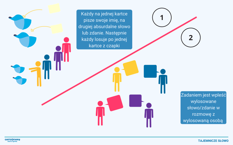 - Zdanie/słowo musi być wprowadzone do konwersacji jak najbardziej naturalnie i niezauważalnie. Druga osoba zgaduje jakie było to słowo lecz jeżeli nie zgadnie to otrzymuje ujemny punkt.