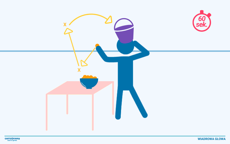 - Na sygnał gracz bierze wolną ręką piłeczkę pingpongową i odbija ją od podłoża tak, aby odbiła się ona od ściany i wpadła do wiadra na głowie.
