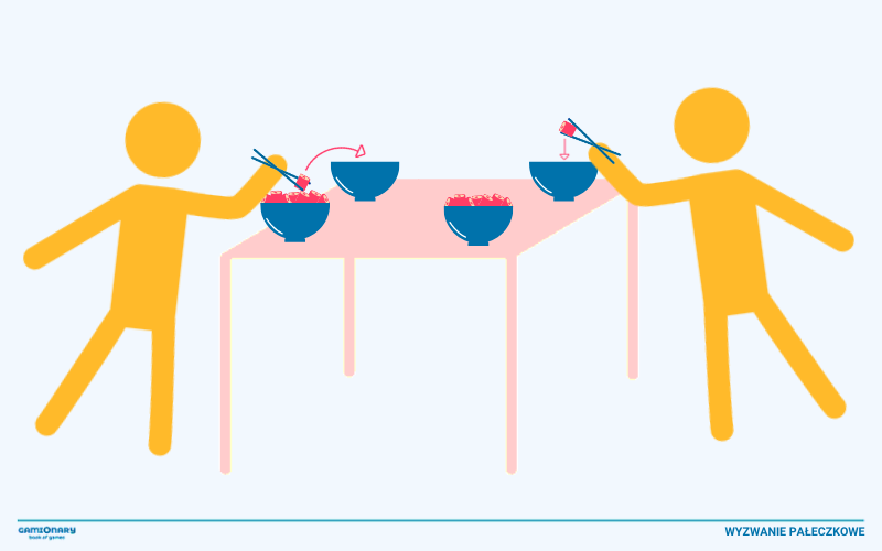 - Na sygnał gracze zaczynają przenosić pianki z jednej miski do drugiej. Muszą to robić jedną ręką, używając tylko pałeczek do sushi.
