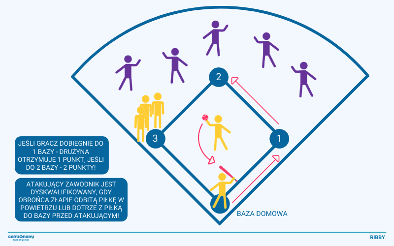 - Gracz atakujący, po odbiciu piłki, próbuje dobiec do pierwszej bazy i jeżeli to możliwe do drugiej.