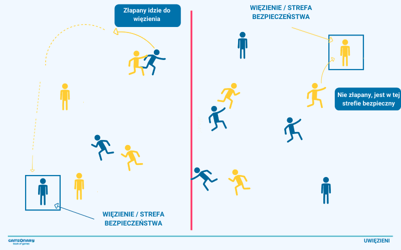 - Każda drużyna wybiera jedną osobę do bycia więźniem, który zostaje w wyznaczonym terenie na polu przeciwnika po drugiej stronie.