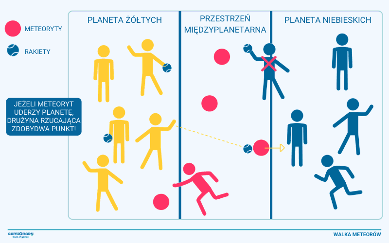 - Jeżeli meteor wpadnie na strefę przeciwnika druga drużyna zdobywa punkt.