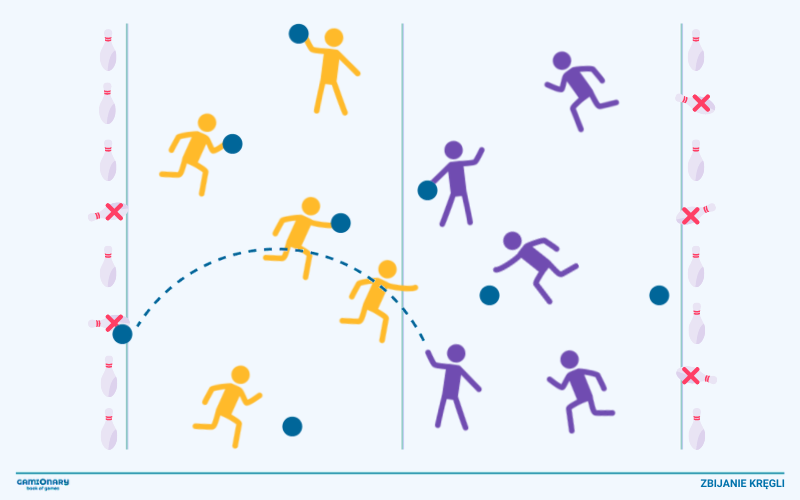- Na sygnał drużyny zaczynają rzucać piłkami tak, aby trafić nimi w kręgle (pachołki) drużyny przeciwnej.