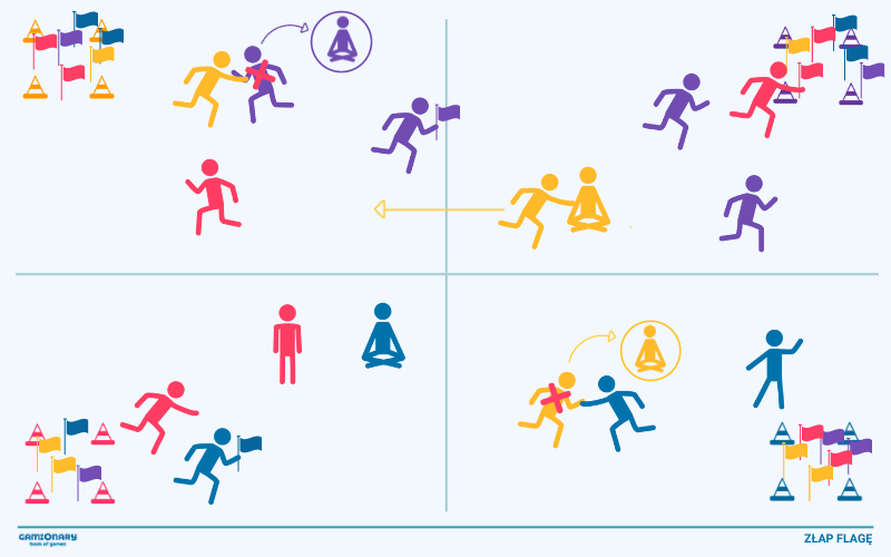 - Umieść w każdej strefie bezpiecznej po 2 flagi w innych kolorach niż kolor danej drużyny z tego pola.