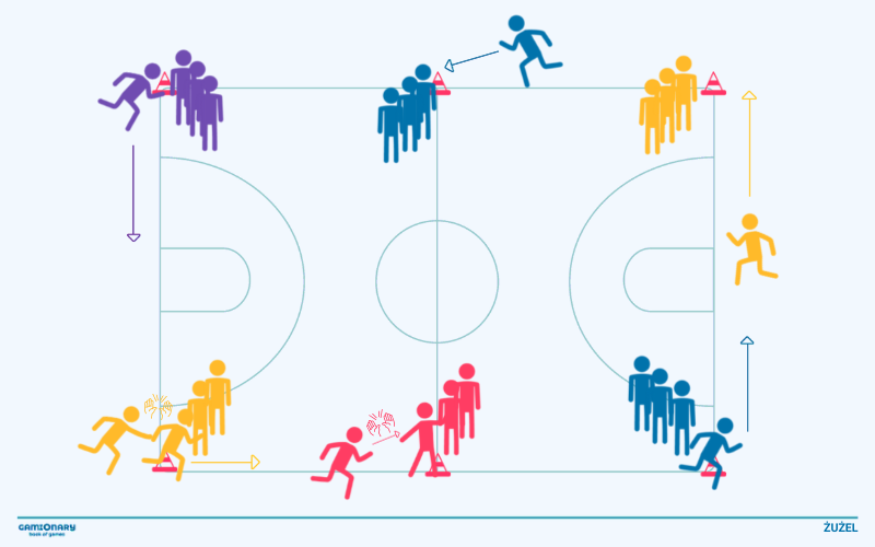 - Na sygnał wszyscy uczestnicy wyścigu startują. Muszą oni przebiec całe okrążenie i przybić piątkę następnej osobie, czekającej przy pachołku. Po przybiciu piątki, kolejna osoba może ruszać.